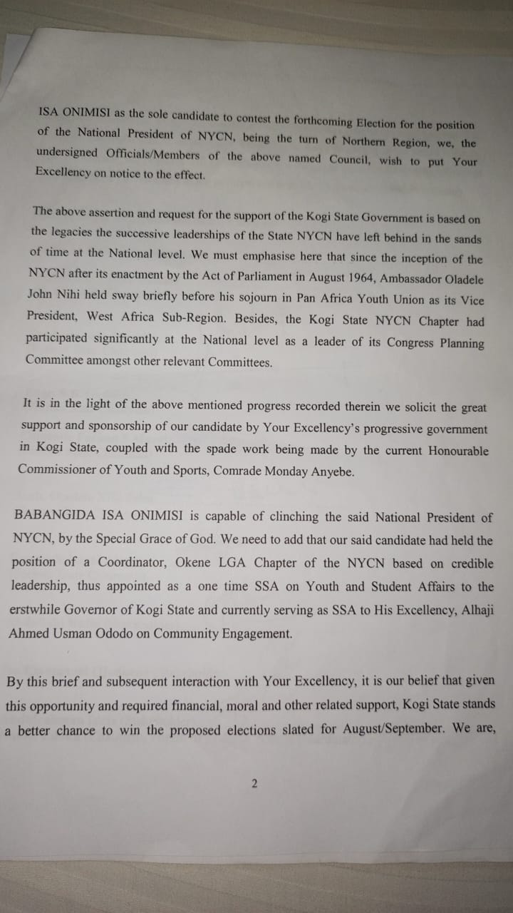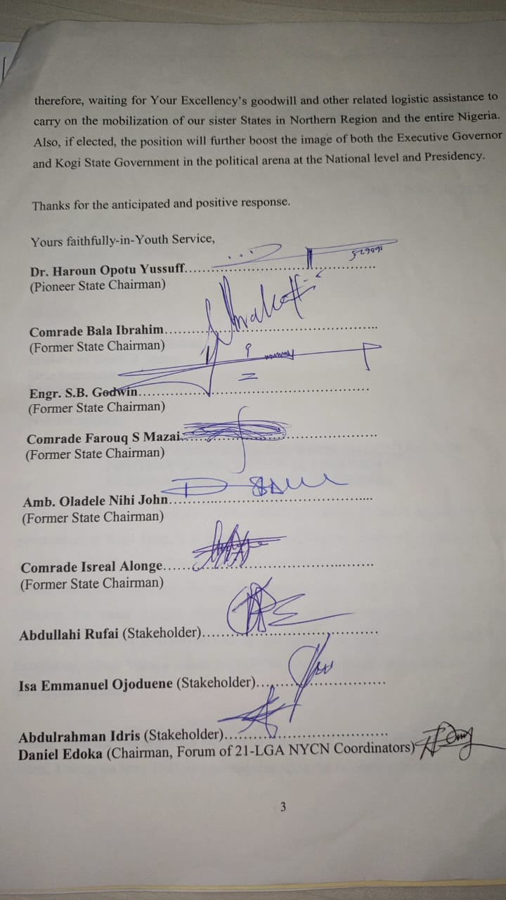 The letter, signed by over ten notable former state chairmen and youth stakeholders, also called attention to the historical impact of the Kogi NYCN chapter at the national level. Notably, Ambassador Oladele John Nihi, a Kogi native currently serving as Vice President of the Pan African Youth Union and led the NYCN Congress Planning Committee with Babangida Isah as the Chairman of the Congress Committee.