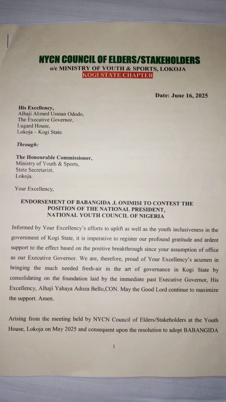 In a communique dated June 16, 2025, and addressed to the Executive Governor of Kogi State, Alhaji Ahmed Usman Ododo, the NYCN elders, Stakeholders and 21 LG forum of Coordinators expressed their gratitude for the governorโ€™s youth-friendly leadership and called for his moral, financial, and logistical support to ensure victory for the Kogi-born aspirant.
