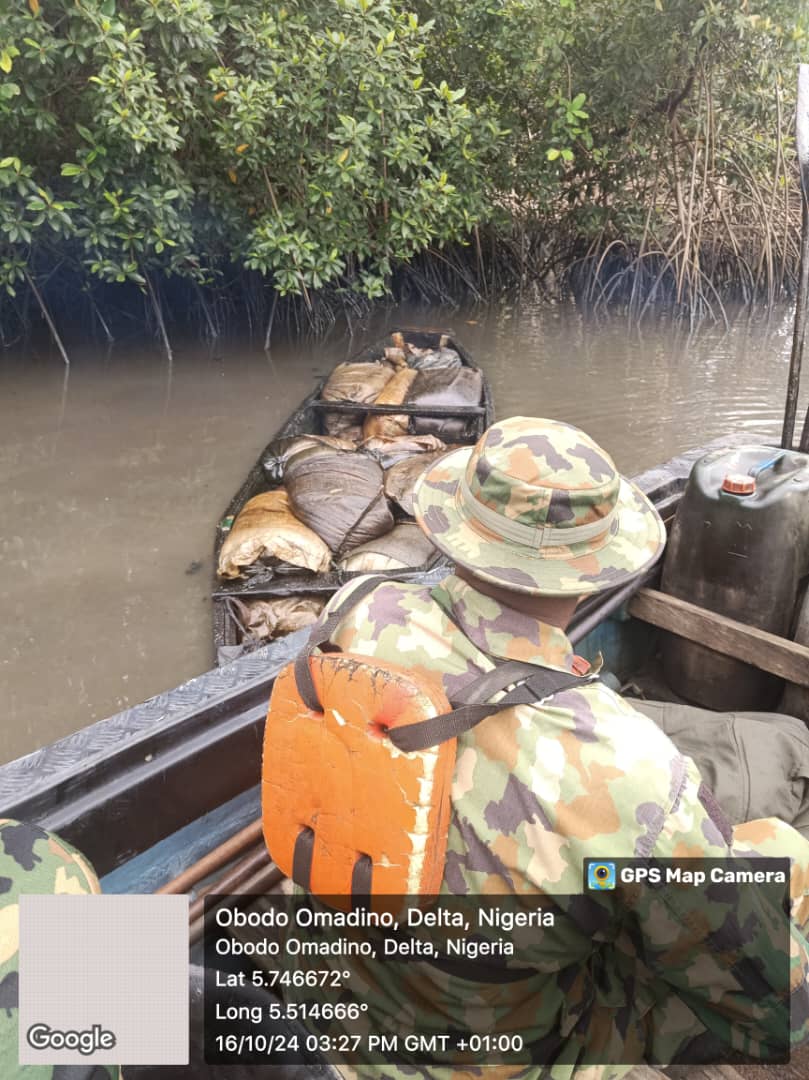 In Delta State, a tipper truck was intercepted with over 30 drums of stolen condensates and two occupants of the vehicle were arrested. Also, at North of Benneth Island in Warri South LGA, two active illegal refining sites were taken out with several holding facilities destroyed. Additionally, several dugout pits were discovered with over 12,500 litres of stolen crude. At Aghigho Oil Field also in Warri South LGA, troops intercepted a wooden boat loaded with crude oil packaged in 40 cellophane bags estimated to be over 1,800 litres.