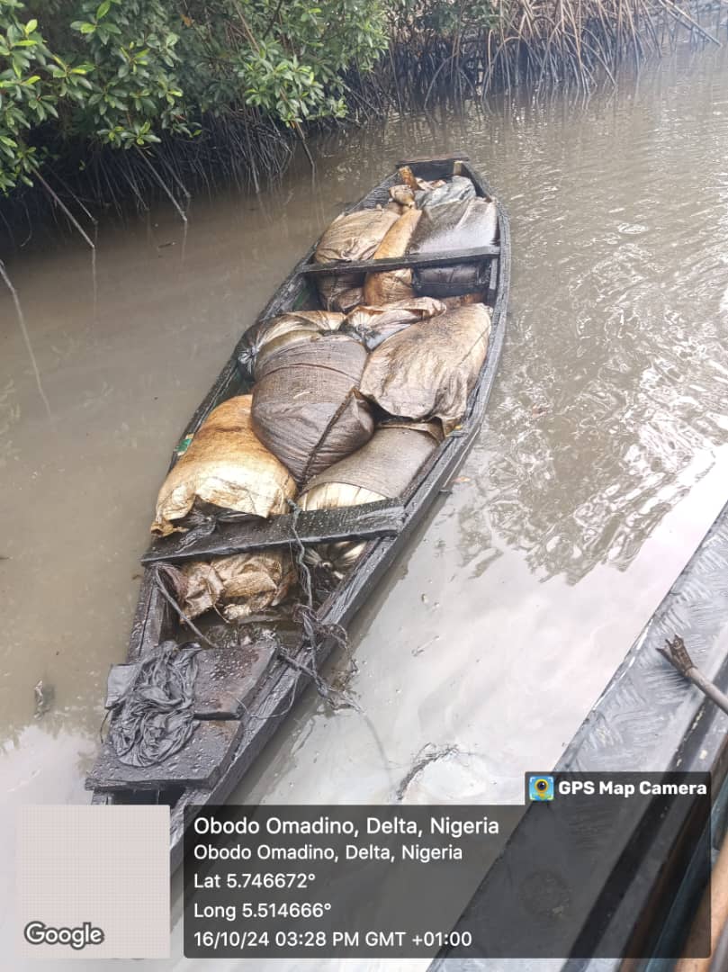 In another decisive operations conducted at Ngiloba community, Ekeremor LGA, several sacks with products estimated to be over 2,000 litres were recovered. This was in addition to 2 empty wooden boats suspected to be used for illegal bunkering activities destroyed. The situation around Okordia forest in Yenagoa LGA, was the same with one illegal refining site destroyed with over 4,000 stolen crude recovered, with one reported case of illegal connection handled.